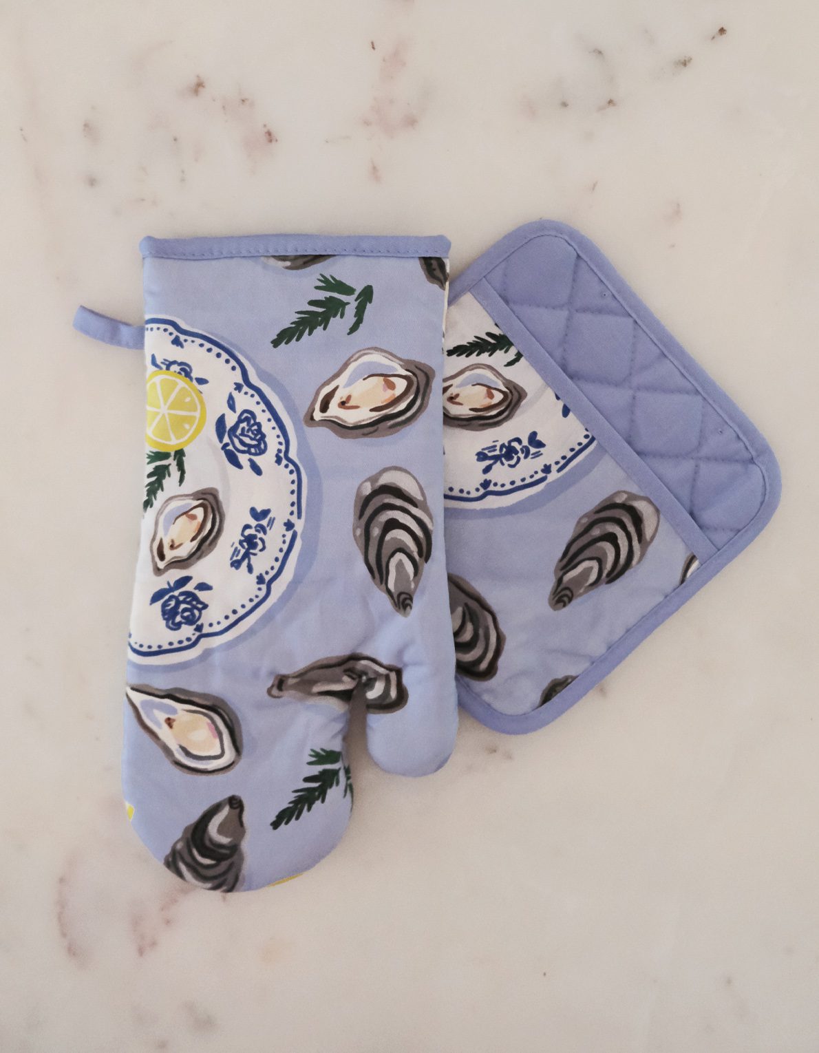 This Pot Holder and Oven Mitt Set features a colorful, hand-painted oyster pattern over a periwinkle background.