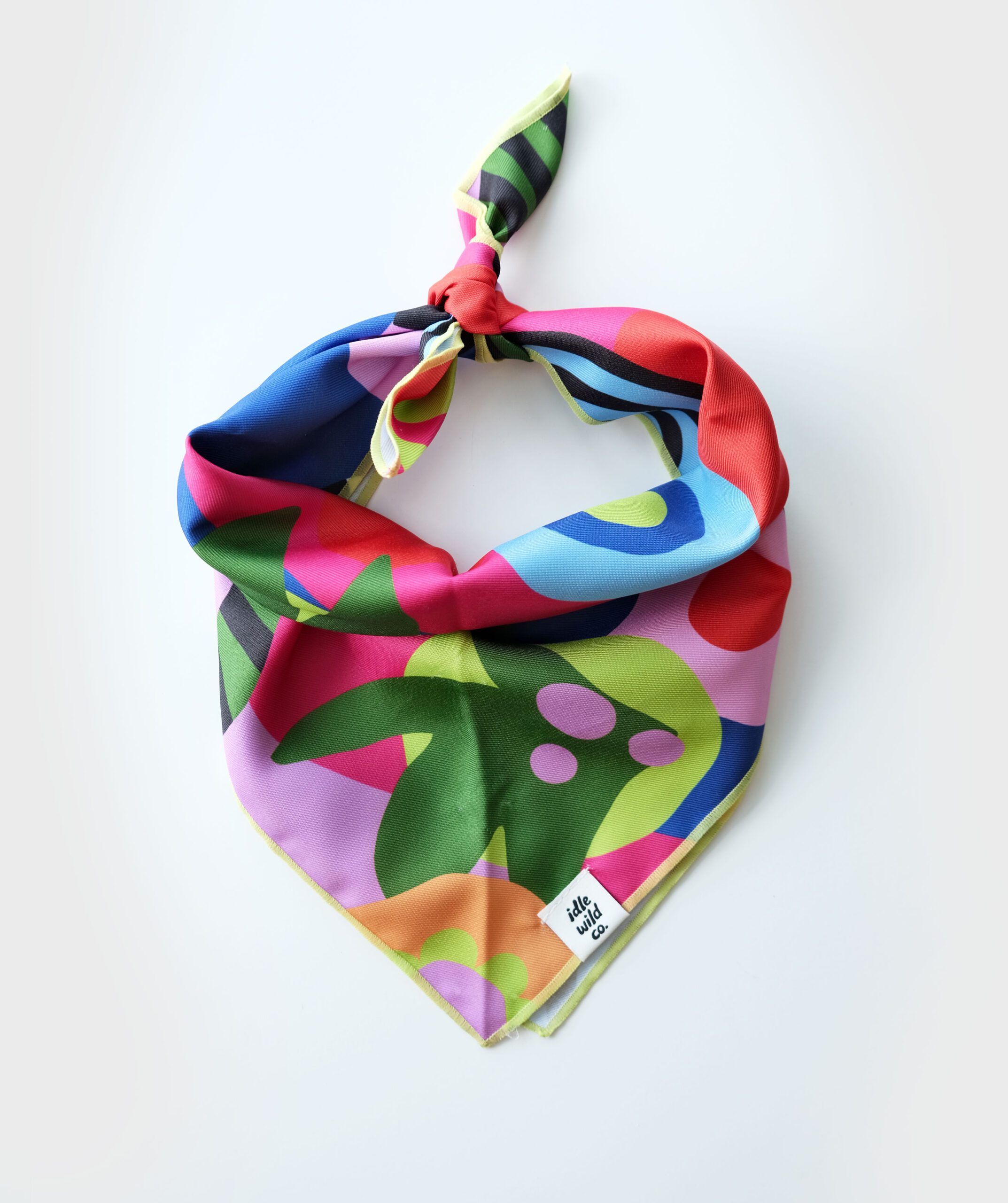 Idlewild Co. Pet Bandanas are adorned with our colorful, hand painted graphic patterns & will spiff your pets in a jiff! Tie in a traditional triangle format, or roll into a neckerchief for a more fanciful style. Best of all, these bandanas are made for play–100% polyester keeps them vibrant & easily washable.