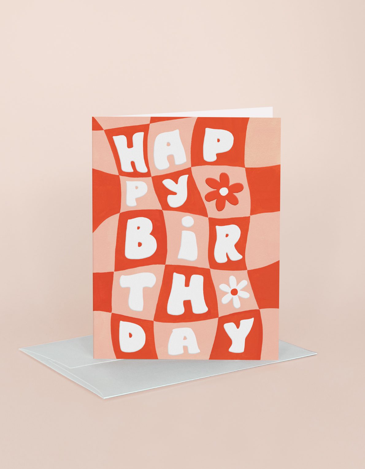 Warped, hand-painted checks and sweet daisies adorn this puffy, embossed birthday design.