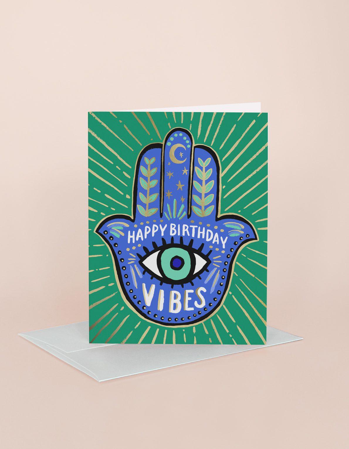 Our hand-painted hamsa is painted in colorful jade and cobalt shades, accented with shiny gold foil detail. The perfect card for sending the best birthday vibes.