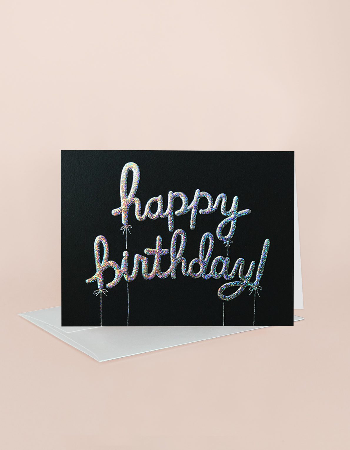 This greeting card features a hand-lettered party, pressed into a pillowy embossing with holographic glitter foil for extra 3-dimensional effect.
