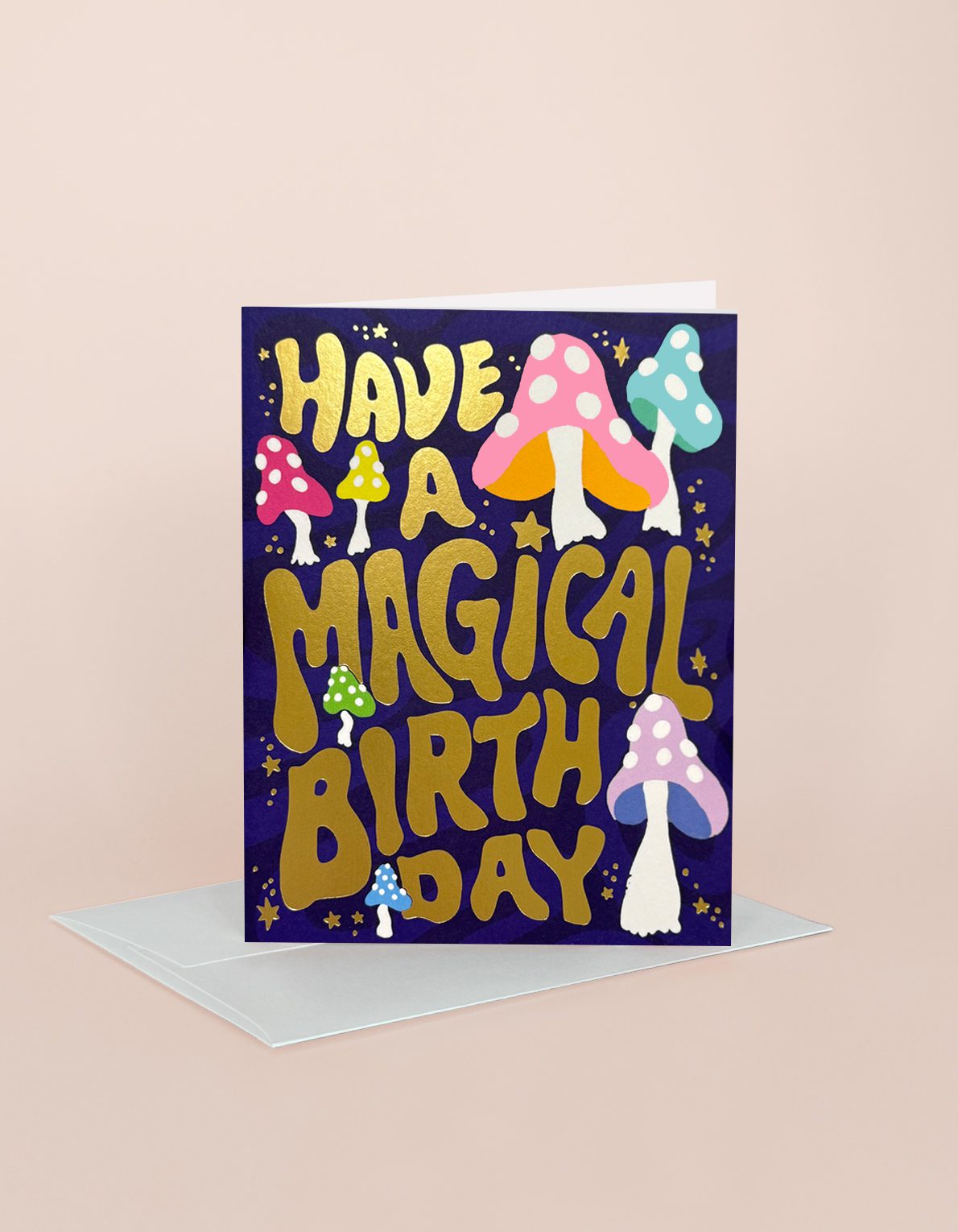 A groovy and fantastical hand-lettered message is illuminated in gold foil, and adorned with colorful & vibrant magic mushrooms.