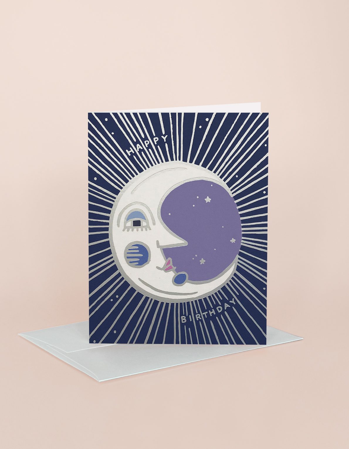 This mid-century inspired moon is printed on an inky, indigo background in sparkly silver foil. The perfect compliment to our Birthday Sun.