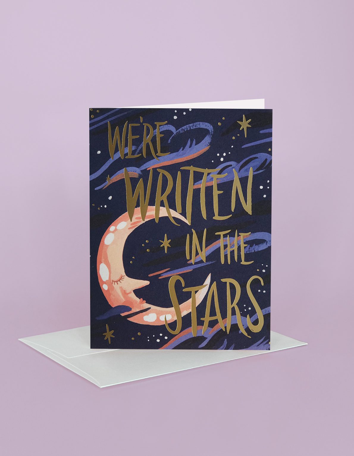 A serene moon in a vibrant sky with a hand-lettered message illuminated in gold foil.