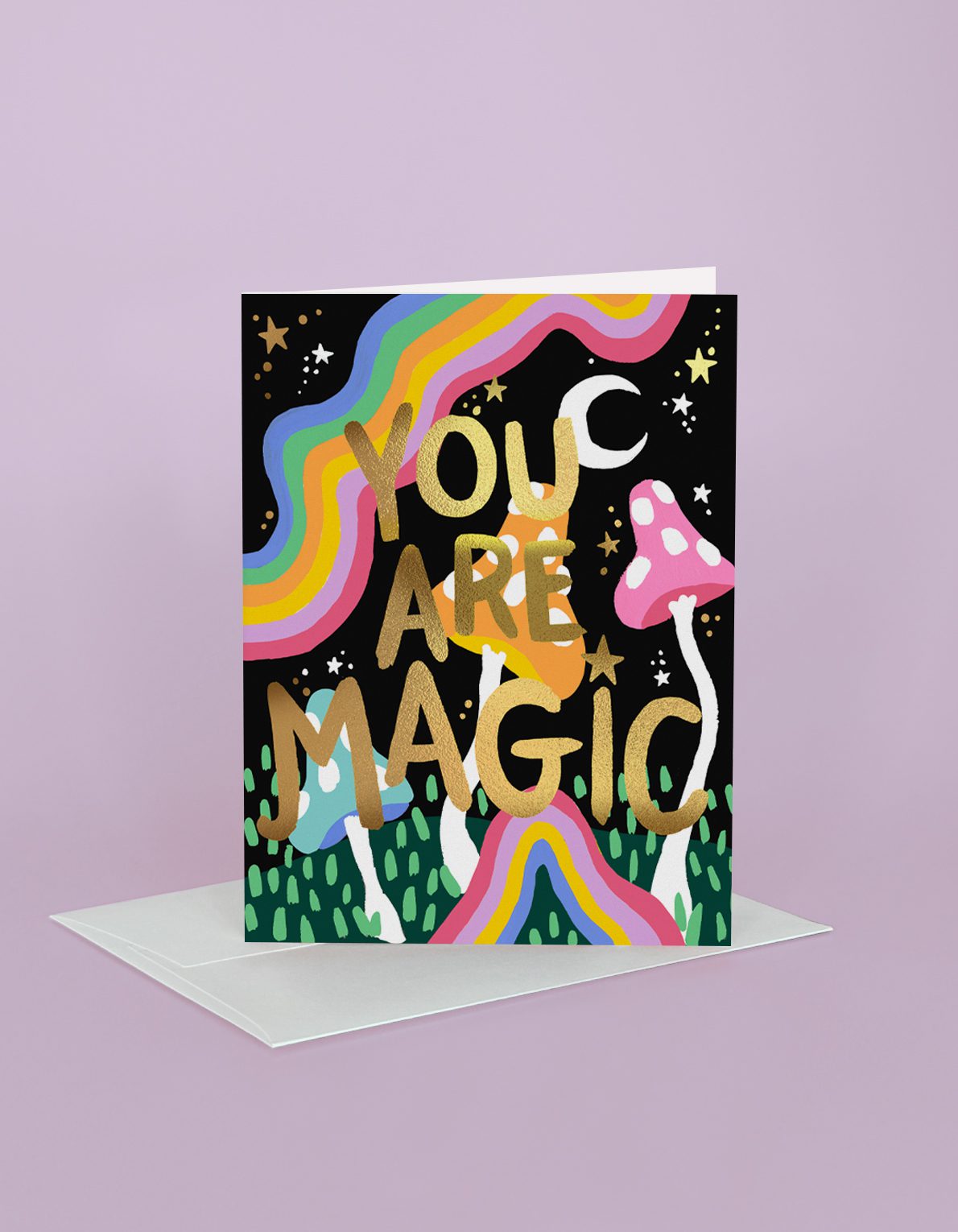 Our hand-painted, magical, midnight mushrooms are illuminated with gold foil details, sending your love with colorful flair.