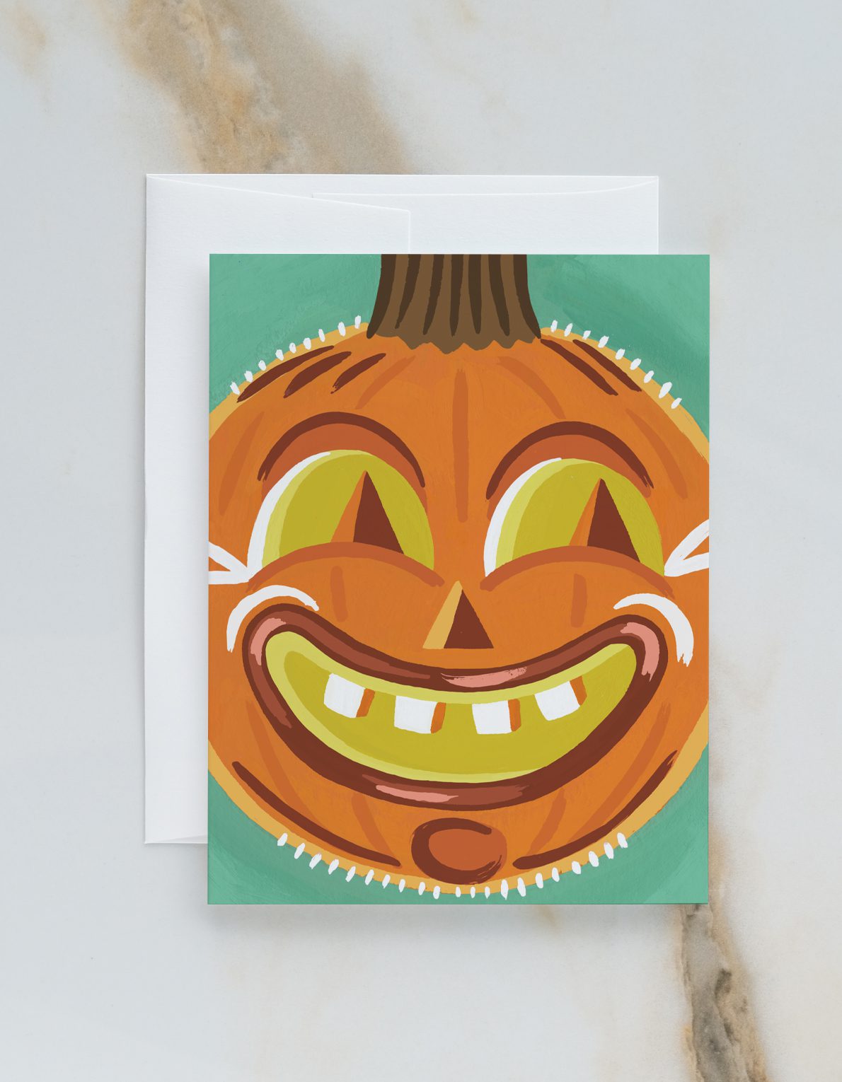 Inspired by mid-century Halloween Masks, these hand-painted greetings feature the most colorful, spooky graphics.
